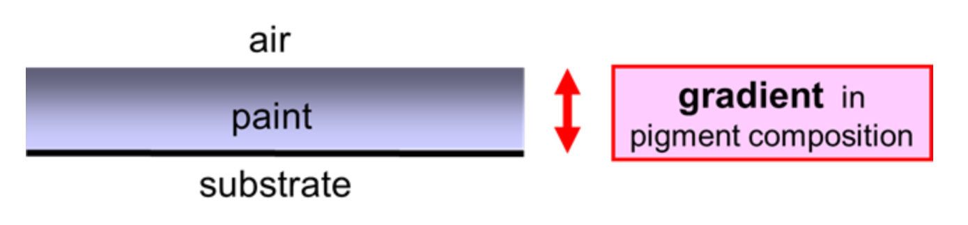 这种现象是梯度的直接结果,是液体从湿膜的大块流向油漆-空气界面。油漆的温度在油漆-空气界面附近最低,因为溶剂在这个界面蒸发。不稳定的可移动颜料会在液体流动中被拖走。当颜料的流动性不同时,就会发生颜料分离,从薄膜的主体到油漆-空气界面。颜料组成的梯度在整个涂层中形成,如图3所示。