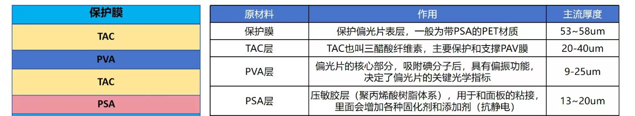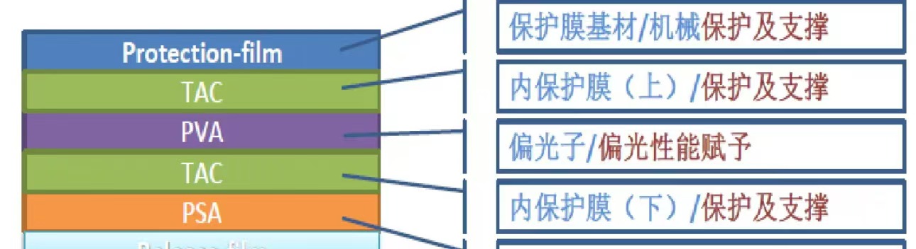 谈偏光片PSA胶水阻抗之前,我们要先弄明白偏光片的核心结构。一张完整的偏光片从上到下的结构包含:保护模、上TAC层、PVA层、下TAC层、PSA胶层及离型膜。关于偏光片的结构,我们在这篇文章中有介绍过: