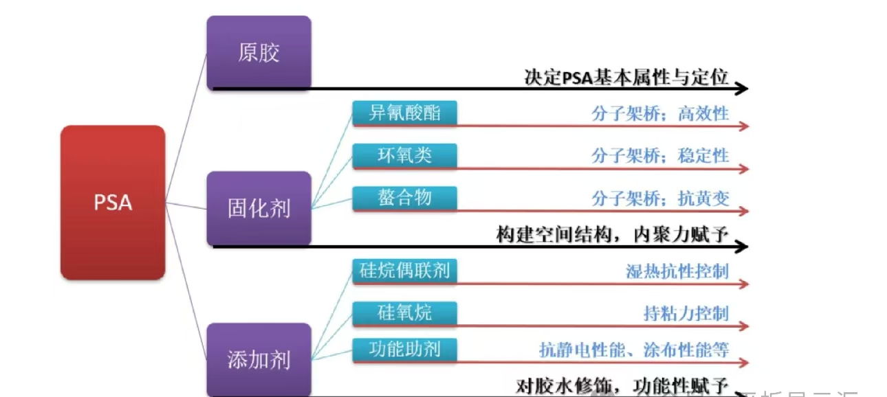 偏光片PSA胶水的组成相对比较复杂,PSA胶水会包含原胶、各种固化剂和添加剂等成分。其各自作用如下: