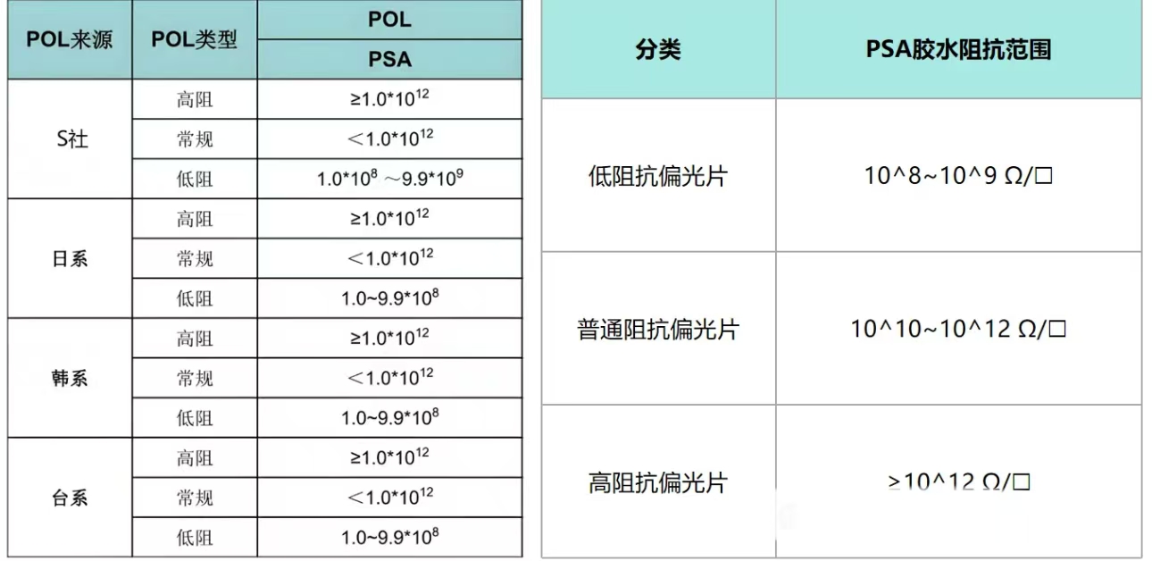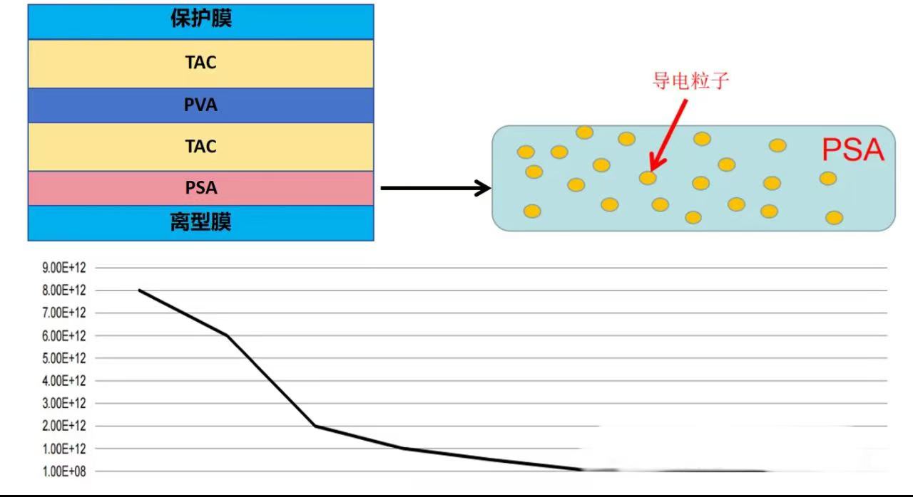 偏光片厂商都可以根据客户要求来进行调整,使PSA阻抗值在10^8~10^13 Ω/(欧姆/方块)范围内。