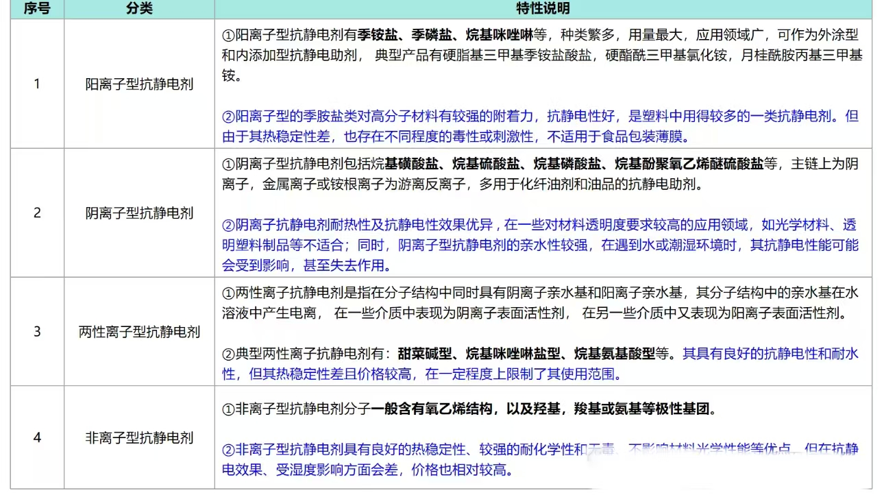 ②有机抗静电剂:按照分子中的亲水基能否电离以及离子化特征,可以分为:离子型和非离子型两大类。 离子型抗静电剂又可以分为:阳离子型、阴离子型和两性离子型抗静电剂。