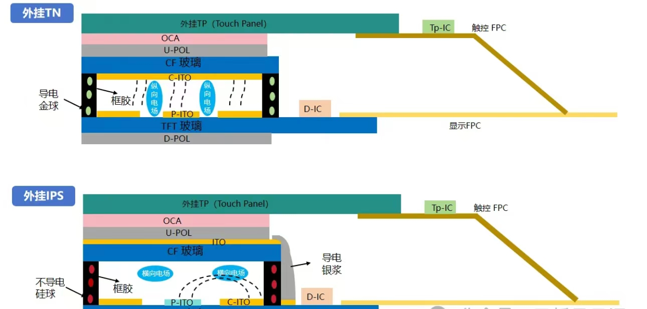 1、外挂①外挂TN:当静电进入TFT-LCD液晶显示模组中后,TN产品的上下ITO电极、框胶中的导电金球、显示FPC的GND、触控FPC和显示FPC连接等,会形成完整的静电传输路径,且CF玻璃上表面没有触控线路。