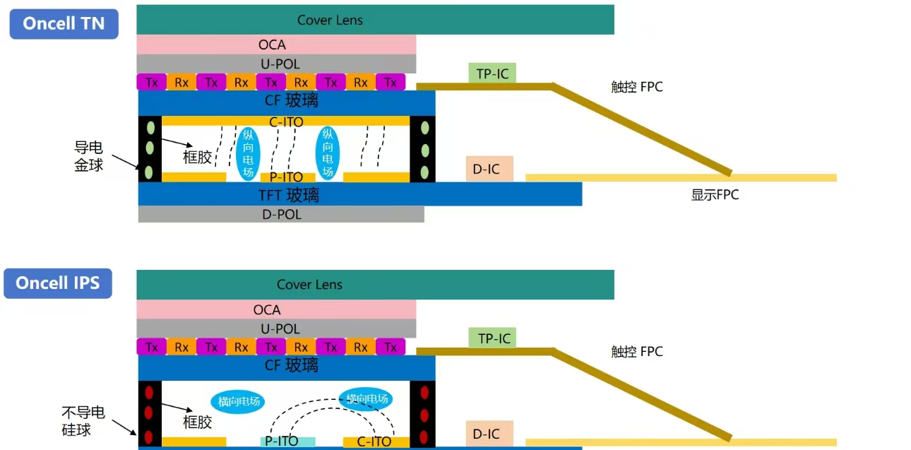 2、On-cell①On-cell TN:当静电进入TFT-LCD液晶显示模组中后,产品的CF上表面触控电极、下ITO电极、框胶中的导电金球、显示FPC的GND、触控FPC和显示FPC连接等,会形成完整的静电传输路径。由于在CF上表面有触控线路,且上偏光片和CF上表面的触控线路是直接接触的,为了不影响触控效果及防止PSA胶水含酸腐蚀电极。所以,上偏光片要选用高阻抗,且要求PSA胶水无酸或弱酸。②On-cell IPS:当静电进入TFT-LCD液晶显示面板中后,IPS产品的CF上表面触控电极、下ITO电极、显示FPC的GND、触控FPC和显示FPC连接等,会形成完整的静电传输路径。由于在CF上表面有触控线路,且上偏光片和CF上表面的触控线路是直接接触的,为了不影响触控效果及防止PSA胶水含酸腐蚀电极。所以,上偏光片要选用高阻抗,且要求PSA胶水无酸或弱酸。