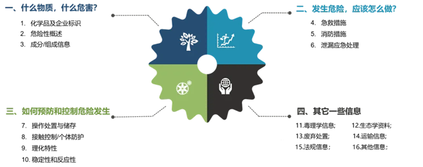 SDS:采用GHS标准,包含16项固定章节(如危害识别、急救措施、运输要求等),强制使用统一符号、信号词和表述,信息更系统、完整。